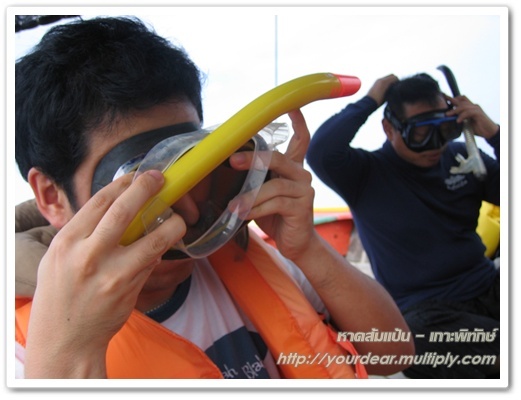 พี่ชู กะพี่โป้ (ชื่อพี่ไกด์) ขนอุปกรณ์สำหรับดำน้ำออกมาแจกลูกทัวร์